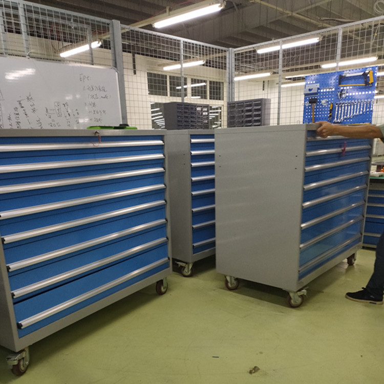 山东工具柜的性能说明: 1、高强度的结果设计和喷粉表面处理工艺,能适应工厂较复杂的工作环境。 2、装有优质轴承和导轨,保证抽屉承受额定载荷时亦能轻松顺畅开合。 3、根据需要可自由选择配置不同高度的抽屉,充分满足生产现场的需要。 4、可以配置带有防油胶垫的**框,保护放置物品不受损害以及防止物品滑落。 5、锁具,保证物品安全。 6、柜体底部配有垫脚,保护柜体在放置或移动时不受损坏,方便用叉车搬运。 7、全宽型抽屉把手及可更换的标签,美观、方便、实用。 8、抽屉安全扣设计,保证抽屉在关闭后不会意外滑出。 9、加底框及高品质的脚轮,推行平稳,方向性好,刹车固定后不会滑动。 10、互锁装置,在打开一个抽屉时其他抽屉自动锁死不能打开,防止抽屉全部打开造成柜体倾斜。